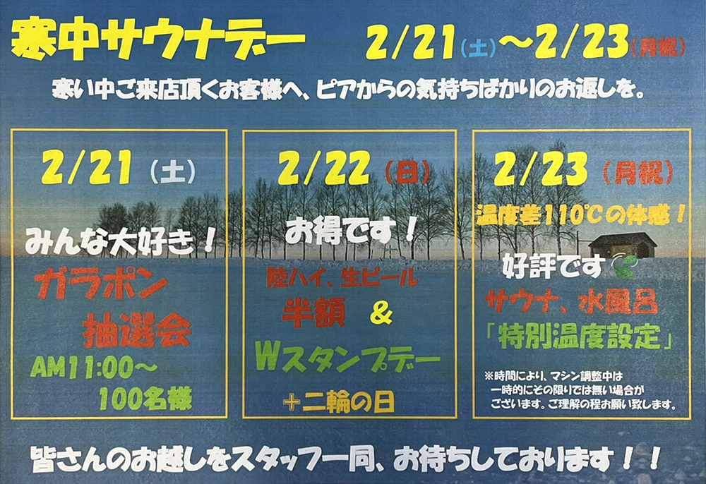 日頃の疲れをサウナピアで癒しませんか。 心身共に癒されるやすらぎの時間を貴男に。
