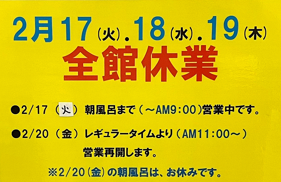● 2/17(火) 朝風呂まで(~AM9:00)営業中です。