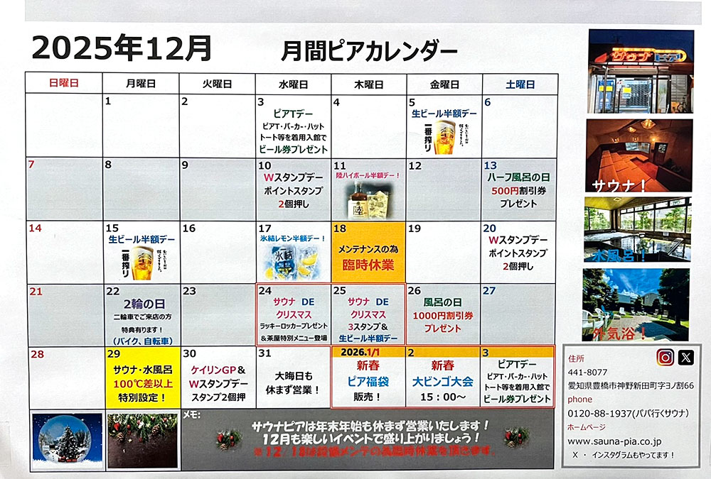 豊橋市の男性専用サウナ、サウナピアは年中無休、オールナイト営業